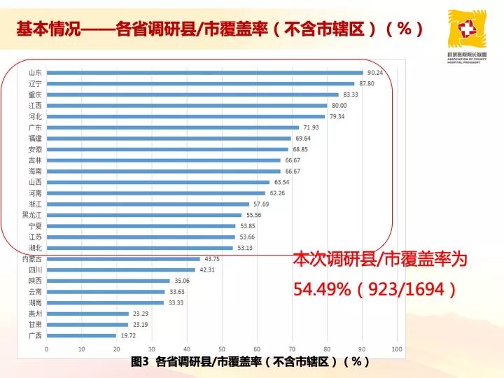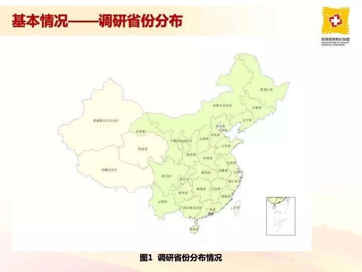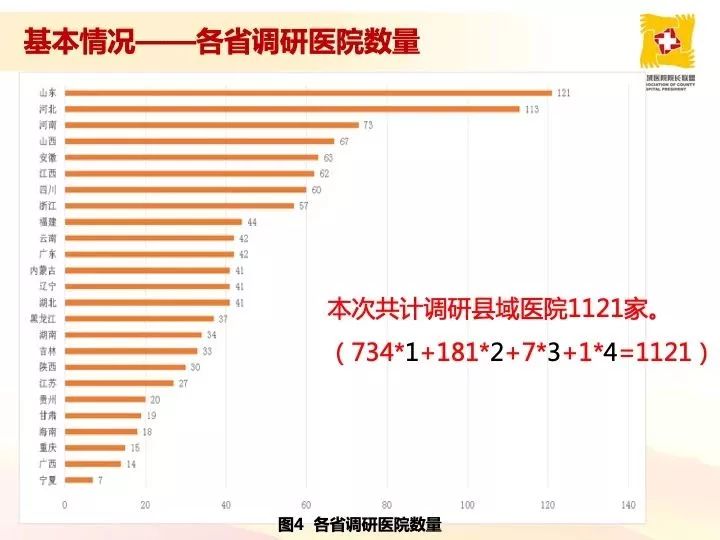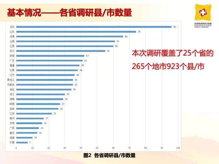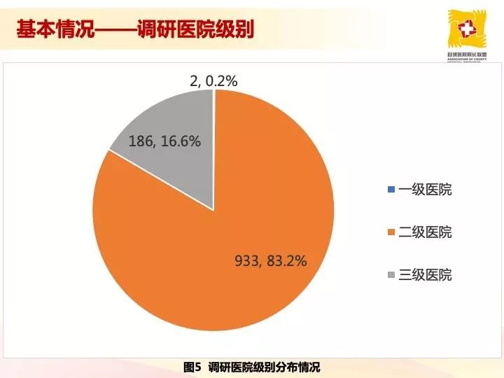 本次调研共调查了全国除北京、天津、上海、西藏、青海、新疆之外的25个省,265个地市923个县/市共计1121家县医院,医院级别以二级医院为主,计933家,占所有被调研医院的83.2%;此外,还有一