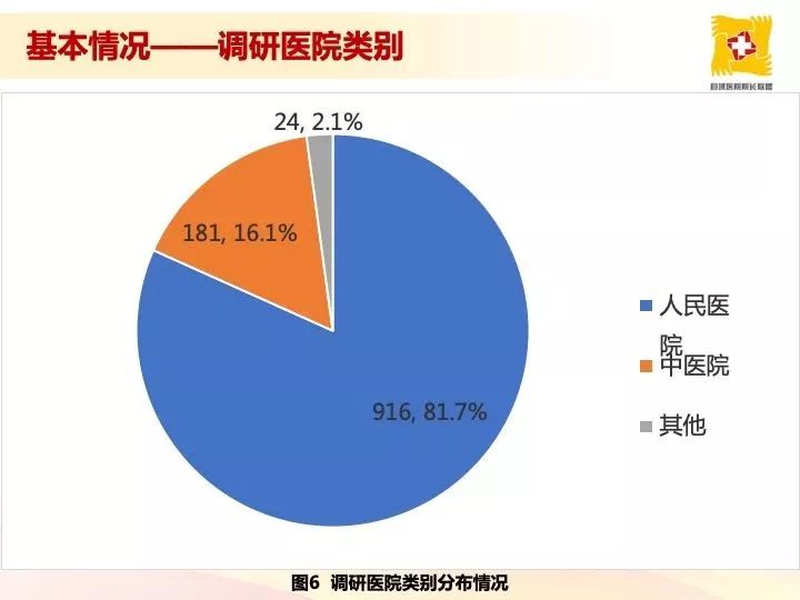 级医院2家,三级医院186家,分别占0.2%和16.6%。医院类别来看,此次调查主要为人民医院,计916家,占所有被调研医院的81.7%;其次为中医院,计181家,占所有被调研医院的16.2%;其它类型医院共计24家,占所有被调研医院的2.1%。