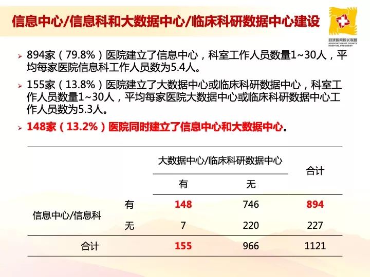 信息中心、大数据中心建设:目前县级医院已基本上建有信息中心/信息科(79.8%),但是大数据中心/临床科研数据中心建设仍相对缓慢(13.8%)。
