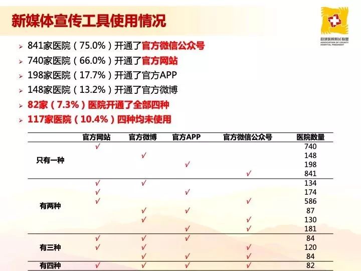 新媒体宣传:随着新媒体的不断普及,目前县级医院也能依托新媒体工具进行医院的宣传,其中微信公众号(75.0%)和官方网站(66.0%)使用比例最高。