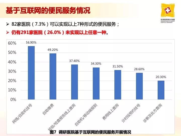 网络便民服务:一半左右的调研医院目前可以基于互联网实现网络/自助机挂号(56.9%)和自助缴费(49.2%),但是仍有291家医院(26.0%)未能实现任意一种的互联网便民服务。
