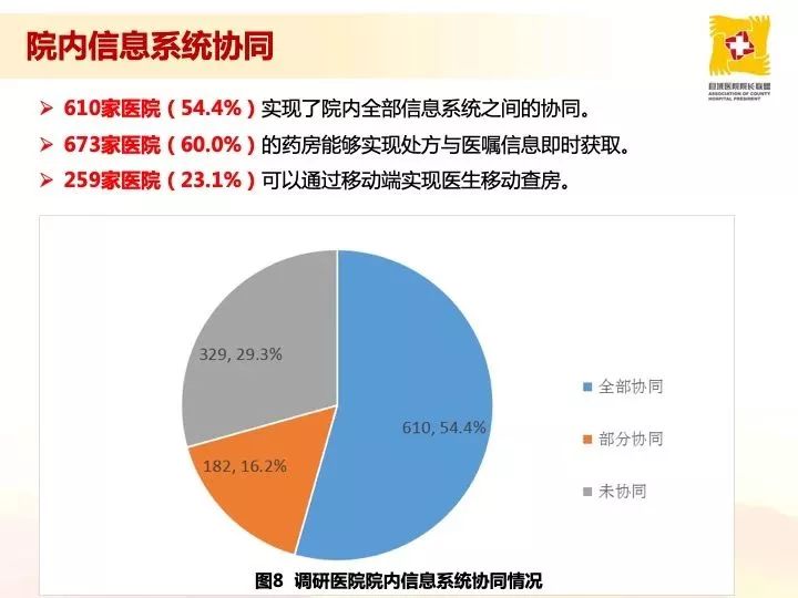 院内信息协同:有一半以上的调研医院实现了院内全部信息系统之间的协同(54.4%)和药房即时获取处方(60.0%),大约四分之一的医院(23.1%)可以通过移动端实现医生移动查房。