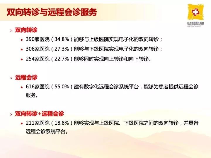 双向转诊、远程会诊:55.0%的医院建有数字化远程会诊系统平台,能够为患者提供远程会诊服务;22.7%的医院能够同时实现电子化向上转诊和向下转诊;18.8%的医院能够实现电子化的双向转诊并具备远程会诊系统平台。