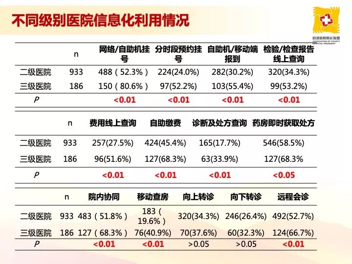 三级医院在利用新媒体宣传工具(网站、APP、微博、微信公众号)、互联网便民服务(网络/自助机挂号、分时段预约挂号、自助机/移动端报到、检验/检查报告线上查询、费用线上查询、自助缴费、诊断及处方查询、药房即时获取处方)、院内信息系统建设(院内系统协同、移动查房)、远程会诊中心建设等方面均优于二级医院。在电子化双向转诊方面,二者无明显差异。