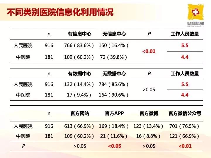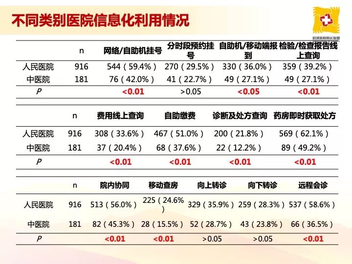 人民医院使用官方微信公众号、官方APP的比例高于中医院,在互联网便民服务(网络/自助机挂号、自助机/移动端报到、检验/检查报告线上查询、费用线上查询、自助缴费、诊断及处方查询、药房即时获取处方)、院内信息系统建设(院内系统协同、移动查房)、远程会诊中心建设等方面均优于中医院。在电子化双向转诊方面,二者无明显差异。