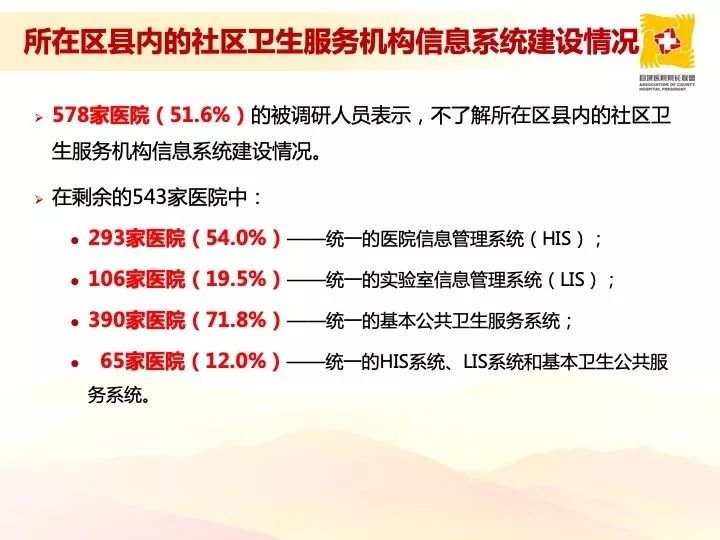 县内社区卫生服务机构信息系统建设:51.6%的医院被调研人员不了解所在区县内的社区卫生服务机构信息系统建设情况,73.1%的医院被调研人员不了解所在区县内的社区卫生服务机构信息系统互联互通情况,提示县医院和辖区范围内社区卫生服务机构的沟通还需要进一步加强。