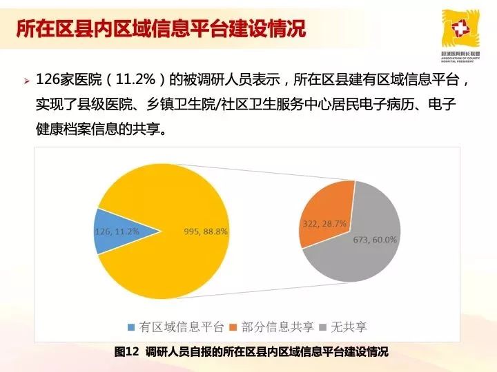 县区域平台建设:目前县域范围内区域卫生信息平台建设仍相对滞后,只有11.2% 的被调研人员反馈所在区县建有区域信息平台。