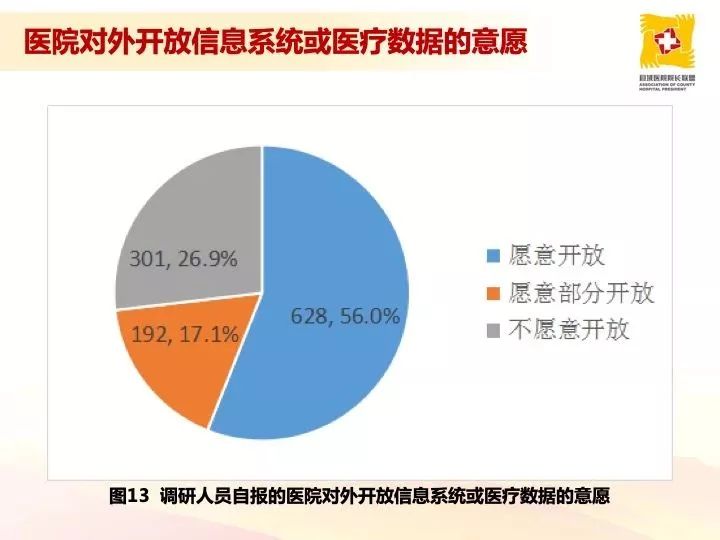 医疗信息、医疗数据对外开放意愿:有26.9%的医院,出于保护患者/医院隐私、信息安全、信息系统尚不成熟、医院不允许/无上级领导批示/无相关文件不愿意对外开放医院数据。