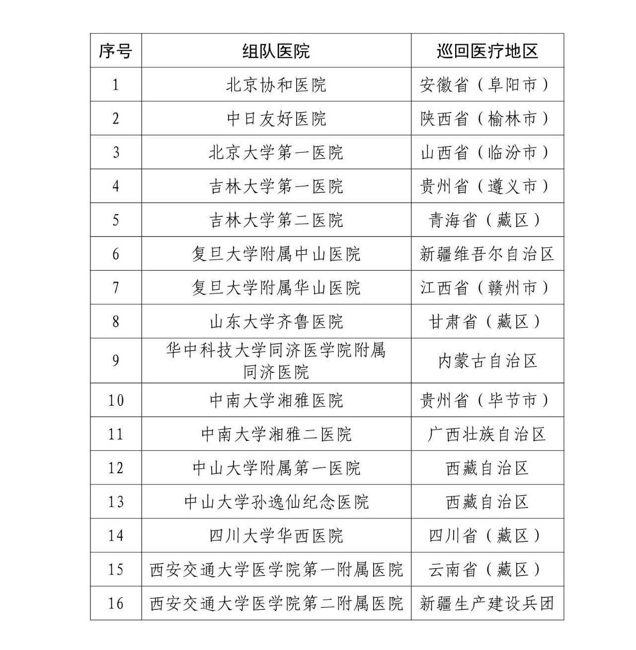 各医院按照2019年国家医疗队巡回医疗地区分布表(附件1)派出医疗队,重点开展以下工作: